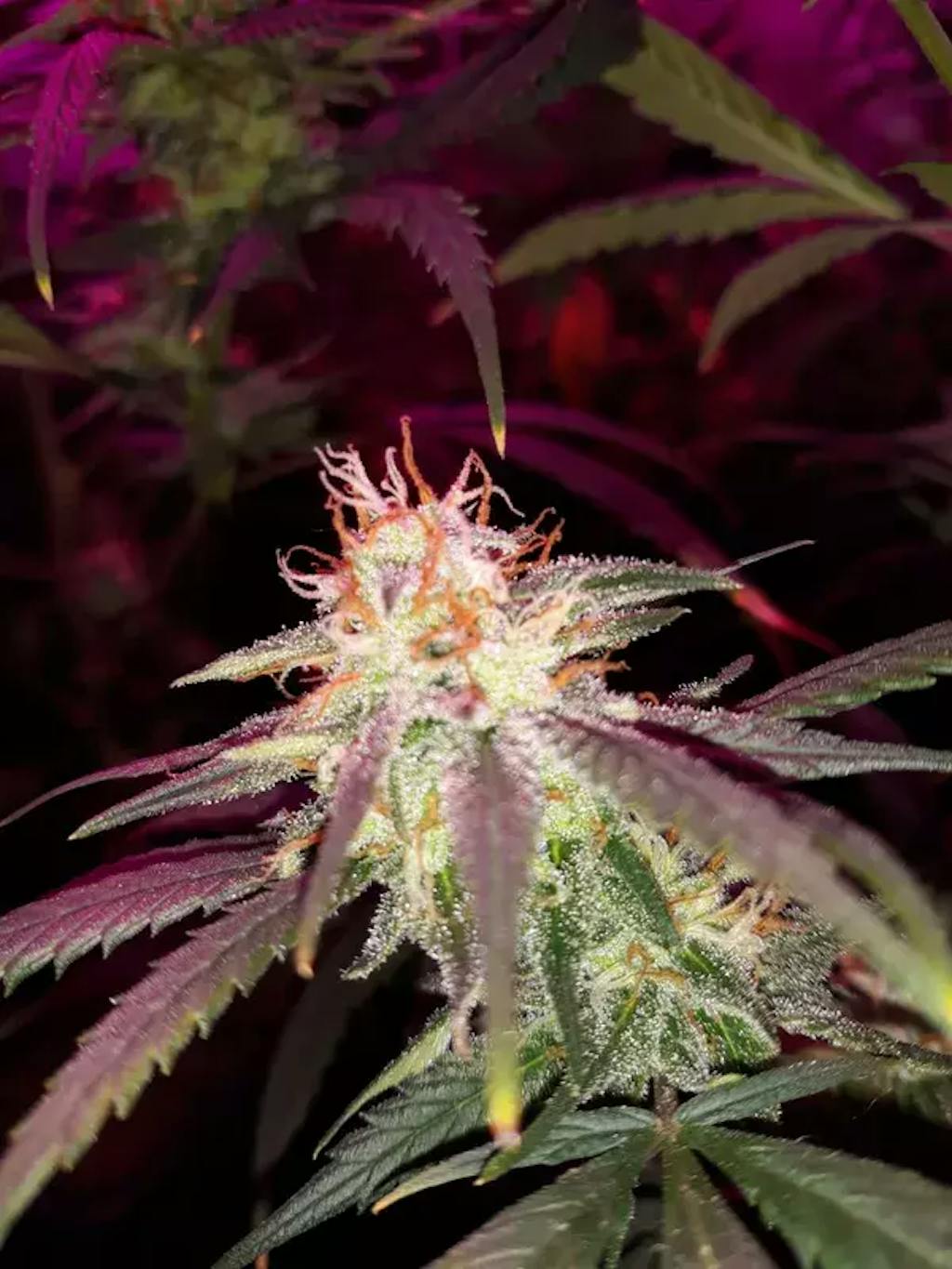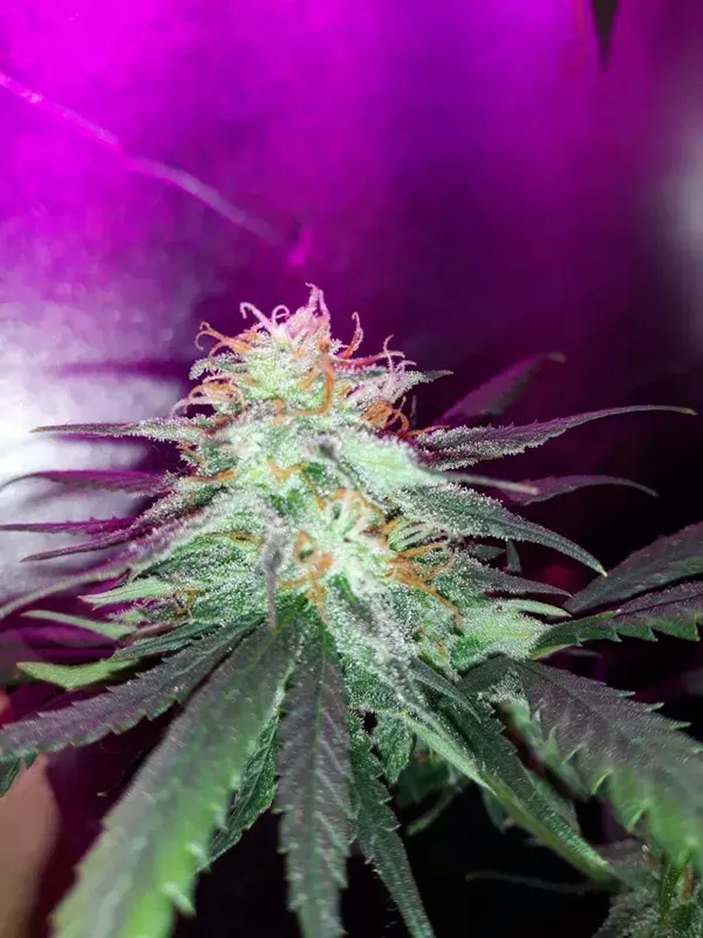 Optik: Strahlend weiße Buds mit lila-grünen Akzenten aus der GDP-Genetik – temperaturabhängige Violettfärbung durch Anthocyane, wie bei mehreren anderen Holy-Hemp-Sorten. Dichte, harzreiche Knospen mit glitzernder Trichomschicht.